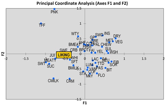 A sensorial characterization was carried out by penalty analysis to identify both drivers of liking and opposing factors. The meaty flavor, white color, juiciness, and soft texture were desirable attributes while the fibrous texture was the main negative aspect for seabass fillets tested. An advantage offered by a penalty analysis is that it allows the visualization of the relationships among attributes that help to choose characteristics to be considered together in the context of improving a food product [30]. PCoA plot obtained from CATA data confirms these findings and shows clearly those attributes associate with “liking” as happened in a previous study [29].