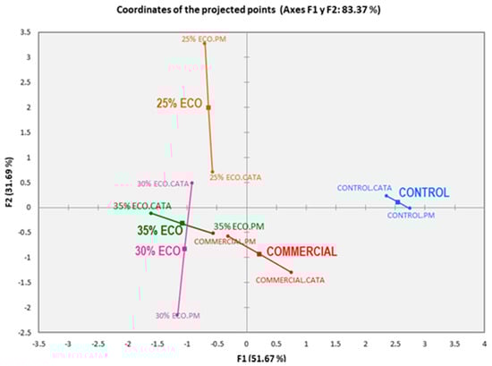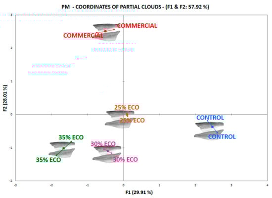 Figure 5 shows the MFA plot for this comparative study, demonstrating that it represents 83.3% of the total variance of the study. Changes in consumers’ perception of sensory attributes for different organic diets, especially in 30% ECO and 35% ECO were appreciated. Both methods (PM and CATA) separated the control from the other diets; commercial has located close to 30% ECO and 35% ECO diets but away from 25% ECO. Regarding commercial, it seems that the criterion of consumers was reasonably consistent for fish from retail. Additionally, for organic diets with the inclusion of more than 30% fish meal, there seems to be an agreement since they were located very close to each other and formed a small group that included commercial. The criteria of both methods (CATA and PM) coincided satisfactorily for the 35% ECO diet while in 30% ECO a significant discrepancy was detected between sensory methods, almost as large as those detected in 25% ECO, in which the PM’s criterion was moved close to the ends in the plot. This last diet was also located separately from all the others and highlights its proximity with treatments 30% ECO according to CATA. As mentioned before, this could be due to differences in the perception of consumers regarding fish attributes.