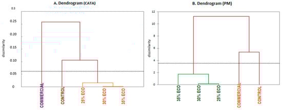 As shown in Figure 4, dendrograms from HCA performed for both methods had a similar configuration and were effective to discriminate among organic diets (ECO), control and commercial, forming three distinct clusters. The fish fed with control diet results were very different from commercial fish as well as from those fed with organic diets (ECO), which remained close and conformed to a small group with different behavior depending on the method considered. CATA (Figure 4A) demonstrated that 25% ECO was different from the couple formed by 30% ECO and 35% ECO. In contrast, PM (Figure 4B) showed a small group, too, but 30% ECO and 25% ECO were similar while the distinct diet was 35% ECO. These results suggest that there were changes in the perception of organic diets among consumers. Maybe the method applied to discriminate can influence the choice of the consumer for one or the other diet (35% ECO or 25% ECO).