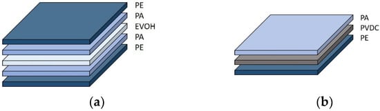 Two exemplary multilayer solutions for meat packaging: (a) 5-layered packaging solution and (b) 3-layered packaging solution. Abbreviations: PE (polyethylene), PA (polyamide), EVOH (ethylene vinyl alcohol), PVDC (polyvinylidene dichloride), PE (polyethylene). Figure adapted from the works in [15,87].