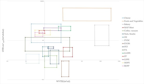 It is not only meat products that require enhanced barrier properties and profit from the use of combined materials; most products that are sensitive to water loss or uptake, oxygen ingress, light, and possible loss of aroma, require barriers to maintain quality over long periods of shelf-life. The shelf-lives of, for example, specific dairy products, sweets and confectionary, cereals, or processed fruits and vegetables are related to barrier properties of the applied packaging solutions. Various degradation mechanisms (e.g., biological) can be slowed down by proper packaging, as the products are for example subjected to ripening, wilting and oxidation processes, just to name a few. Next to that, the microbiological safety stands in relation to gas/vapor permeability. Packaging can be one key within a hurdle concept, to keep food products at high quality [3,77]. However, the matching of product needs together with the possible barrier ranges of packaging material in Figure 3 shows, that often, one material alone, cannot serve the barrier requirements (water vapor transmission rate (WVTR)/oxygen transmission rate (OTR)) of specific products [88].