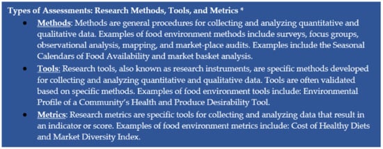 The assessments were categorized as either a method, tool, or metric (See Figure 1 for definitions and examples) and assigned to one or more of the eight dimensions of the external and personal domains of the Turner et al., (2018) food-environment framework. For this study, methods were defined as general procedures for collecting and analyzing quantitative and qualitative data such as surveys, focus groups, observational analysis, mapping, and audits. Tools were defined as research instruments specifically developed to collect and analyze quantitative and qualitative data, often based on a specific method. Metrics were defined as parameters, indexes, and indicators used to measure, compare, or track performance or outcomes.