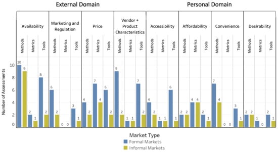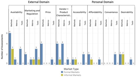 The food-environment dimensions in the external domain with the most assessments rated as suitable without modification for use in both informal and formal markets were availability for methods (three methods) and vendor and product characteristics for both tools and metrics (one tool and one metric). The food-environment dimensions with the most personal domain assessments rated as suitable without modification for use in both informal and formal markets were desirability for methods (two methods) with no suitable tools or metrics.