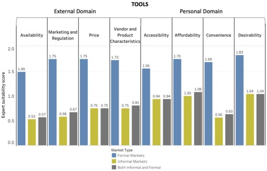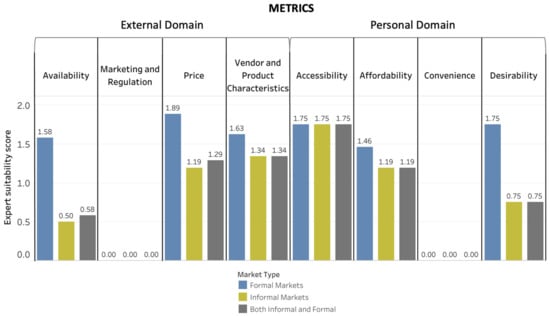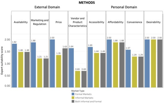 For methods, price was the food-environment dimension with the highest Suitability Score (1.63) for both informal and formal markets, whereas desirability was the dimension in the personal domain with the highest Suitability Score (2.0). Vendor and product characteristics had the highest Suitability Score for tools (0.81) and metrics (1.32) in the external domain of the food environment. Affordability was the food-environment dimension in the personal domain with the highest Suitability Score for tools (1.04), and accessibility had the highest Suitability Score for metrics (1.75).