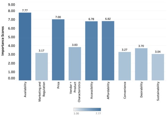 Experts perceived availability (Importance Score, 7.71), accessibility (Importance Score, 7.04), affordability (Importance Score, 6.92), and price (Importance Score, 6.42) as the dimensions most important for understanding rural contexts in LMICs for influencing diets and nutrition. When considering a program perspective, the Importance Score order (from highest to lowest) differed from that of the experts’ personal perspective as follows: availability (7.77), price (7.0), affordability (6.82), and accessibility (6.78) (Figure 7).