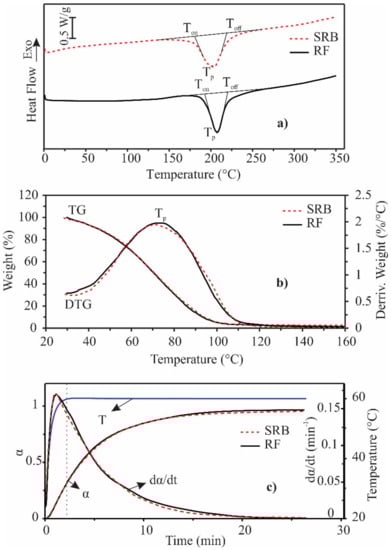 (a) DSC and (b) TG/DTG curves of Russian (RF) and Serbian (SRB) rosemary essential oils in non-isothermal condition at heating rate of 5 °C/min; (c) degree of conversion (α), evaporation rate (dα/dt) and temperature (T) as a function of time in isothermal condition at 60 °C for RF and SRB rosemary essential oils (beginning of isothermal conditions is marked by a vertical dashed line). Abbreviations: DSC—differential scanning calorimetry, TG—thermogravimetry, DTG—differential thermogravimetry.