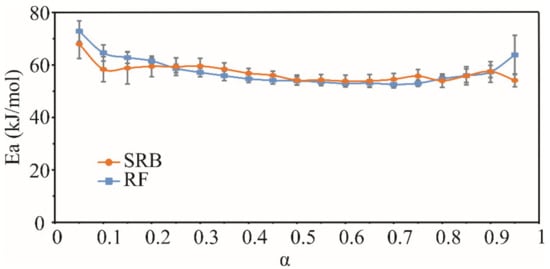 The activation energies (Ea) of the evaporation obtained by the Friedman method [19] were in range from 52.5 to 72.6 kJ/mol for RF EO, and from 53.8 to 67.9 kJ/mol for SRB EO. In the literature, the activation energy of evaporation for pure substances is associated with the enthalpy [43,44]. The enthalpies of evaporation of the most prevalent compounds ranged from 37.9 to 52.8 kJ/mol for both oils [41]. These values are slightly lower than the experimentally obtained activation energies of the essential oils’ evaporation process. However, it should be kept in mind that essential oils are complex systems consisting of dozens of different components. These components in the system can physically interact, which can affect their evaporation process. Therefore, they can affect the activation energies of the essential oil evaporation process, which should essentially be the average value of the evaporation enthalpies of individual components of essential oil. Ea values did not vary significantly with the increase in the extent of conversion (α), for both EOs (Figure 2).