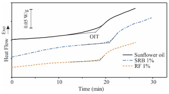 In order to examine the effect of adding EOs on the oxidative stability of sunflower oil, five concentrations (0.1, 0.5, 1, 5 and 10% (w/w)) of RF and SRB EO in sunflower oil were made. Sunflower oil without the addition of EO was used as a control sample. The oxidative stability of all sunflower oil samples was determined by measuring the oxidation induction time (OIT) using the DSC method [21], at 140 °C and under oxygen flow of 50 mL/min. Open aluminum pans were used, and mass of samples was 3.0 ± 0.3 mg. OIT represents the time from the heating of the oil sample at a certain isothermal temperature to the beginning of the oxidation process in it. The higher OIT values indicate that the analyzed oil sample is more oxidatively stable.