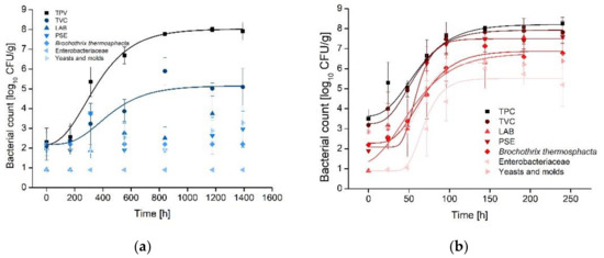 - Pothakos, V.; Samapundo, S.; Devlieghere, F. Total mesophilic counts underestimate in many cases the contamination levels of psychrotrophic lactic acid bacteria (LAB) in chilled-stored food products at the end of their shelf life. Food Microbiol. 2012, 32, 437–443. [Google Scholar] [CrossRef]