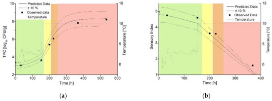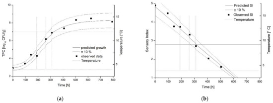 - Bruckner, S.; Albrecht, A.; Petersen, B.; Kreyenschmidt, J. A predictive shelf life model as a tool for the improvement of quality management in pork and poultry chains. Food Control 2013, 29, 451–460. [Google Scholar] [CrossRef]