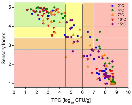 | TPC log10 CFU/g | <4.5 | 4.5–6 | 6–7 | >7 |