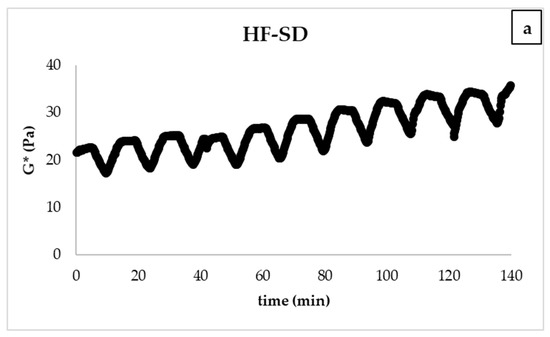 The emulsion stability of the salad dressing samples was determined by the thermal loop test [26]. The thermal loop test could be used as a fast method to measure emulsion stability by subjecting to different numbers of thermal cycles. By the thermal loop test, the temperature fluctuations were simulated during the processing, production, storage, and transportation stages. The structural or morphological changes due to the applied thermal stress were determined by the change of modules (G*, G′) from cycle to cycle. Figure 6 shows the change in G* value after applied thermal stress. As can be seen, after 10 applied thermal cycles, a slight increase in the G* value of all samples was observed for the samples POBLF-SD and HF-SD. A dramatic increase in the 10th thermal cycle was observed in the G* value of LF-SD, indicating that LF-SD had lower emulsion stability than other samples. The insignificant change in POBLF-SD and HF-SD indicates that these samples were resistant to thermal stress and have high emulsion stability.