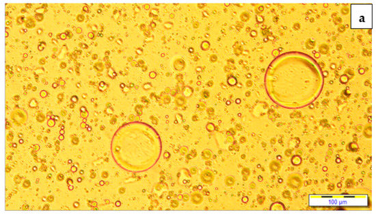 The zeta potential values, oil particle size (d32), and PDI value of the samples were found as (−43.15)–(−39.68) mV, 3125.67–51.96.00 μm, and 0.27–0.90, respectively (Table 5). As can be seen, the sample containing POB exhibited lower particle size and PDI value. These results are similar to salad dressing studies in the literature [7,8]. The adsorption of negatively charged polysaccharides onto the negatively charged proteins’ surfaces via various interactions such as H-bonding and hydrophobic contact resulted in higher negative zeta potential. Salad dressing samples with the greatest zeta potential were found to have a value of (−43.15)–(−39.68) mV. Salad dressing samples with high zeta potential values may have been anticipated to have long-term stability [8]. These results are consistent with the thermal loop test. A decrease was observed in the zeta potential values of the samples as the water ratio increased. However, all samples have a sufficient zeta potential value.