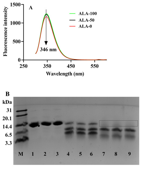 The molecular weight distribution of samples obtained from the tricine SDS PAGE pattern is outlined in Figure 1B. Obvious bands of ALA-0, ALA-50, and ALA-100 approaching 14.4 kDa were visible (Lanes 1–3 in Figure 1B), and the three bands (Lanes 1–3) had a similar migration distance. No major changes of lanes 1–3 were discovered in the tricine SDS PAGE pattern, revealing ultrasound treatment could not cause ALA aggregate to polymers or degrade to low-molecular-weight products [31]. Therefore, combined with the analysis of intrinsic fluorescence spectra, after ultrasound treatment, the tertiary structure of ALA was unfolded but the primary structure was not destroyed.