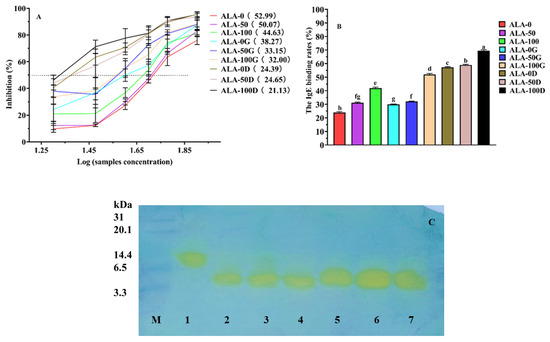 The IgG (A) and IgE (B) binding abilities of ALA treated by ultrasound during in-vitro gastric and gastroduodenal digestion determined by icELISA. Rabbit anti-ALA IgG was incubated separately with 20, 30, 40, 50, 60, 80 μg/mL substrate samples, gastric and gastroduodenal digesta. Letters (a–g) demonstrate significant differences (p < 0.05). Western blotting pattern (C) of ALA-0 (Lane 1), ALA-0G (Lane 2), ALA-50G (Lane 3), ALA-100G (Lane 4), ALA-0D (Lane 5), ALA-50D (Lane 6), and ALA-100D (Lane 7). The molecule weight distribution of marker (M) ranges from 3.3 to 31 kDa. IgG: immunoglobulin G, IgE: immunoglobulin E. ALA-0: untreated ALA, ALA-50: ultrasound-treated ALA at 50 W/cm2, ALA-100: ultrasound-treated ALA at 100 W/cm2. ALA-0G, ALA-50G, and ALA-100G: ALA-0, ALA-50, and ALA-100 digested by simulated gastric juice. ALA-0D, ALA-50D, and ALA-100D: ALA-0, ALA-50, and ALA-100 digested by simulated gastric juice followed simulated duodenal juice.