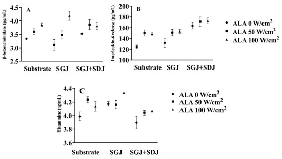 Influence of ultrasound treatment on the release of bioactive mediators. The release of β-Hex (A), the release of IL-6 (B), and the release of histamine (C). Substrate includes ALA-0, ALA-50, and ALA-100; SGJ is gastric digesta including ALA-0G, ALA-50G, and ALA-100G; SGJ+SDJ is gastroduodenal digesta containing ALA-0D, ALA-50D, and ALA-100D. SGJ: simulated gastric juice, SDJ: simulated duodenal juice. ALA-0: untreated ALA, ALA-50: ultrasound-treated ALA at 50 W/cm2, ALA-100: ultrasound-treated ALA at 100 W/cm2. ALA-0G, ALA-50G, and ALA-100G: ALA-0, ALA-50, and ALA-100 digested by simulated gastric juice. ALA-0D, ALA-50D, and ALA-100D: ALA-0, ALA-50, and ALA-100 digested by simulated gastric juice followed simulated duodenal juice.