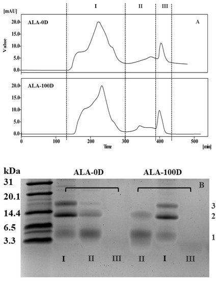 We found that gastric/gastroduodenal digesta still had strong anaphylaxis, especially for ALA-100D. We therefore took ALA-100D as an example to isolate by gel filtration chromatography. ALA-0D and ALA-100D were isolated by the Sephadex G-25 column (Figure 4). Based on A220, the chromatogram was divided into three groups (I, II, and III), and the molecular weight of the three groups followed the order: group I > group II > group III.
