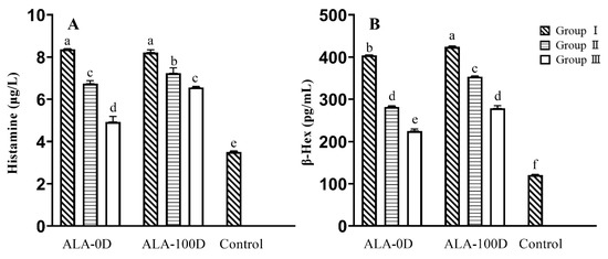 The KU812 cells degranulation of groups I, II, and III isolated from ALA-0D and ALA-100D. The release of histamine (A) and β-Hex (B). Letters (a–f) demonstrate significant differences (p < 0.05). ALA-0D and ALA-100D: untreated ALA and ultrasound-treated ALA at 100 W/cm2 digested by simulated gastric juice followed simulated duodenal juice.