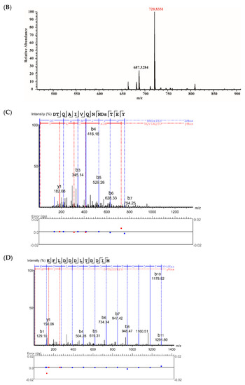 MS spectra of the anti-digestive stable peptides of DTQAIVQNNDSTEY and KFLDDDLTDDIM (A,C). HCD-MS/MS spectra of DTQAIVQNNDSTEY and KFLDDDLTDDIM (B,D).