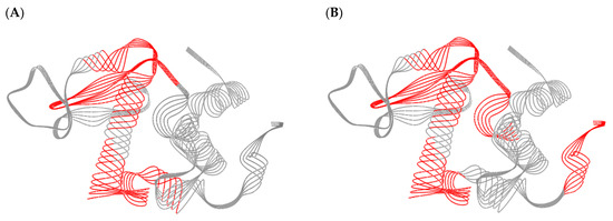 The 3D structure of ALA and the anti-digestive stable peptides of groups Ⅱ (A) and Ⅲ (B). The anti-digestive stable peptides are marked in red. Protein Data Bank (PDB) code: 1F6R. ALA: α-lactalbumin.