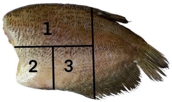 Diagram of the semi-dried Gourami fish used for physicochemical analysis. Each number indicates the part of the fillet used for the different analyses: (1) texture and color; (2) moisture, protein, lipid content, TBARS, and pH; and (3) drip loss, cooking loss, and cooking yield (Modification from Hernández et al. (2009) [18]).
