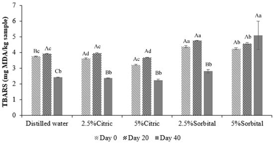 Thiobarbituric-acid-reactive substances (TBARS) assay is the method to detect lipid oxidation, consisting mainly of malondialdehyde (MDA) as a representative of aldehydes MDA formed through hydroperoxides, which are the initial reaction product of polyunsaturated fatty acids with oxygen [8]. MDA of the sample soaked with distilled water was increased significantly (p < 0.05) in the 20 days of storage from 3.76 to 3.93 mg MDA/kg sample and then decreased at day 40 (3.93 to 2.42 mg MDA/kg sample). MDA of the samples soaked with 2.5%, 5% citric acid, and 2.5% sorbitol was not significantly (p > 0.05) different before 20 days of storage and decreased at day 40. However, MDA values of frozen fish fillets soaked with 5% sorbitol were high (5.10 mg MDA/kg sample) at day 40 (Figure 2). The increased MDA values in 20 days of storage cause the decomposition of peroxide. In general, several authors indicated a steady increase in MDA over the storage period [31,32,33]. After 20 days of storage, the decline in the TBA level could produce secondary lipid oxidation products (MDA) observed in frozen fish fillets and affect the reaction between MDA and other compounds in the fish fillets [34].