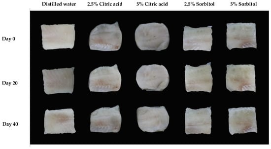 Whiteness is a critical parameter for evaluating the quality of fish products. Color values of frozen fish fillets soaked with solutions and distilled water are shown in Table 4. The day 0 of L*, a*, and b* of frozen fish fillets soaked with distilled water were 45.67, −3.39, and 0.96, respectively. After 20 days of frozen storage, the fillets tended to be lighter and more yellowish compared to fresh fillets (p < 0.05). Increase in parameters b* and a* represented an increase in yellowness and redness of frozen fish fillets, respectively. The L* and b* values increased significantly after 20 and 40 days of storage, but a* showed slightly changes during storage. During freezing, the yellow color of fish fillets was increased, and red color was increased at the posterior end of the fillets, causing a visible change in appearance (Figure 3). All samples became less red due to the reduced freshness and greyer appearance compared to day 0. An increase in L* value indicated the development of lipid oxidation during storage time, leading to a brighter fillet [36]. Frozen fish fillets soaked with citric acid solution demonstrated effectively increased whiteness (L*) and yellowness (b*) compared to the other samples during storage. The color values of fish fillets soaked with sorbitol solution were similar to the samples soaked with distilled water.