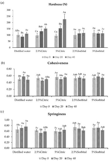 Frozen fish fillets were thawed and analyzed the texture properties as shown in Figure 4. The average values of hardness, cohesiveness, springiness, and gumminess displayed significant variations (p < 0.05) among different treatments. Hardness of thawed fish fillets soaked with citric acid were increased during storage time. Frozen fish fillets soaked with 2.5% citric acid increased from 97.80 ± 16.68 N (day 0) to 152.28 ± 12.98 N (day 40). Thawed fish fillets soaked with 5% citric acid solution had the highest hardness values (p < 0.05) at 226.97 ± 40.16 N. It may be the moisture and greater drip losses of the samples that affected the hardness. Hardness of thawed fish fillets decreased, whereas the liquid loss increased. A low pH was directly related to the loss of texture due to the increase in proton concentration [6,7,9], leading to the weakening of connective tissue and protein denaturation [26]. Citric acid solution increased the hardness and gumminess of restructured fish meat related with the decrease of springiness in thawed fish fillets soaked with citric acid. Frozen fish fillets soaked with citric acid had a low pH (4.35–5.56). The pH values were close to the isoelectric point of fish proteins (pH = 5.5) [37], leading to increase hardness and gumminess. Texture properties of thawed fish fillets soaked with sorbitol were not significantly different compared to the control sample. In addition, there were no significant differences in cohesiveness (p > 0.05) among samples.