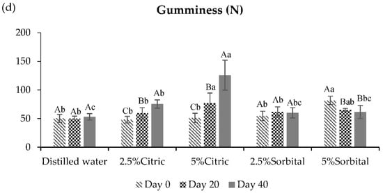Texture profile analysis (TPA) of frozen fish fillets soaked with different solutions after thawing during storage times. (a) Hardness; (b) cohesiveness; (c) springiness; (d) gumminess. Different small superscript letters on the bar are significantly different (p < 0.05) with respect to the treatment. Different capital superscript letters on the bar are significantly different (p < 0.05) with respect to the period of storage. The results are reported as mean ± SD (n = 5).