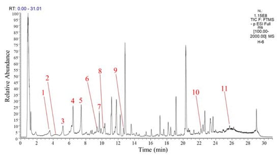 Our previous study showed that GPH extracts mainly contained flavonoids and their derivatives and could alleviate oxidative stress induced by d-galactose in rats []. Therefore, the main phenolic substances in the GPH extracts were quantified using the UHPLC-LTQ-Orbitrap-MS/MS method. The content of flavonoids and their derivatives were quantified as quercetin equivalent, and the calibration curve was y = 30,000,000x + 276,499 (R2 = 1.000). A total of 11 substances were quantified, as shown in Figure 1 and Table 2. Peaks 1, 2, and 3 were tentatively identified as (Epi)catechin conjugate 1, (Epi)gallocatechin dimer, and (Epi)catechin conjugate 2 with contents of 496.53 ± 30.60, 214.68 ± 15.01 and 628.70 ± 40.06 µg quercetin/g GPH extract, respectively. Peaks 4 and 5 containing 1409.24 ± 60.01 and 1381.57 ± 91.18 µg quercetin/g GPH extract were tentatively identified as quercetin derivative. Peaks 6 and 7 were two different kaempferol trihexoside with contents of 492.17 ± 36.28 and 989.83 ± 53.77 µg quercetin/g GPH extract. Peaks 10 and 11 were tentatively identified as isorhamnetin glycoside and naringenin with contents of 294.18 ± 25.20 and 239.15 ± 13.00 µg quercetin/g GPH extract. Small amounts of quercetin 3-glucoside (peak 8, 45.76 ± 5.02 µg quercetin/g GPH extract) and theaflavin derivative (peak 9, 23.34 ± 2.52 µg quercetin/g GPH extract) were quantified in GPH extracts. Quercetin and its derivatives had the highest contents (2836.57 µg quercetin/g GPH extract), followed by kaempferol trihexoside (1482.00 µg quercetin/g GPH extract) and catechin and its derivatives (1339.91 µg quercetin/g GPH extract).