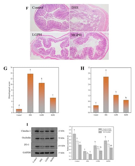 GPH extracts mitigated the symptoms and relieved the colonic injury and inflammatory infiltration of DSS-induced UC mice. (A) Schematic diagram of the experiment; (B) body weight; (C) DAI score; (D) representative photographs of colon length; (E) quantitative results of colon length; (F) representative photographs of H&E staining of colonic tissues (magnification ×100); (G) histopathological score of colonic tissues; (H) MPO activity of colonic tissues; (I) expression of tight junction proteins in colonic tissues. Values not sharing a common superscript letter denote significant difference (p < 0.05).