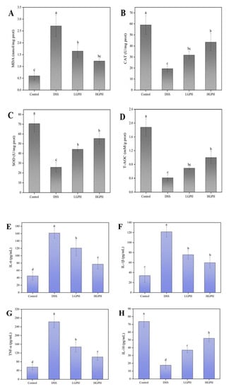 GPH extracts protected colon from oxidative stress and improved the inflammatory status in DSS-induced UC mice. (A) MDA; (B) CAT; (C) SOD; (D) T-AOC; (E) IL-6; (F) IL-1β; (G) TNF-α; (H) IL-10. Values not sharing a common superscript letter denote significant difference (p < 0.05).