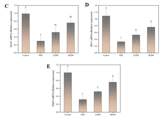When Nrf2 is transferred to the nucleus, it will promote the expression of downstream antioxidant-related proteins. GCLC, HO-1 and NQO1 gene expression levels were significantly reduced by the DSS treatment (p < 0.05), but they were significantly recovered by the high-dose GPH extracts treatment compared with the DSS group (Figure 4C–E, p < 0.05), and these results were consistent with the changes of Nrf2 in the cytoplasm.