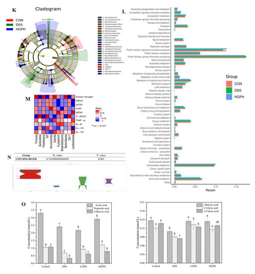 GPH extracts altered gut microbiota in mice with DSS-induced colitis. Gut microbiota composition at the phylum level (A) and family level (B); different groups of differential microbial taxa at the phylum level (C,D) and family level (F–J); the ratio of Firmicutes/Bacteroidetes (F/B) at the phylum level (E); taxonomic cladogram obtained from LEfSe analysis of 16S sequences (K); KEGG pathway analysis (L); Spearman’s rank correlation coefficients (M); ANOSIM analysis (N); SCFAs content (O). Values not sharing a common superscript letter denote significant difference (p < 0.05).