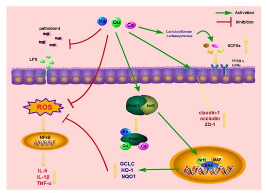 Proposed mechanism and pathway of GPH extracts in ameliorating DSS-induced UC in mice. Qu: quercetin; Ka: kaempferol; Ca: catechin.