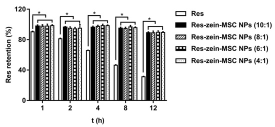 Res is known to be highly sensitive to ultraviolet (UV) radiation, and it could undergo chemical epimerization and degradation under UV light [36]. Therefore, the photo-stability of Res was investigated and compared before and after the encapsulation. Due to its poor photo-stability, only 90.27, 81.15, 65.69, 46.37 and 31.29% of free Res was retained after 1, 2, 4, 8 and 12 h of UV exposure, respectively (Figure 2). However, the encapsulated Res in nanoparticles remained stable after 12 h of UV radiation and 88.86–89.64% of Res was retained in zein-MSC NPs with different mass ratios of zein to Res. These results suggested that zein-MSC NPs was able to protect Res against UV radiation, agreeing to several previous results that the photo-stability of Res was improved after encapsulation into protein-based nanoparticles [24,37]. These observations might be explained by the fact that the UV light was partly absorbed by aromatic groups and double bonds in proteins, and meanwhile the protein-based nanoparticles could also scatter UV light more efficiently [4]. Meanwhile, the small loss of Res-zein-MSC NPs observed under UV radiation may be due to the degradation of unencapsulated Res on the surfaces of nanoparticles.
