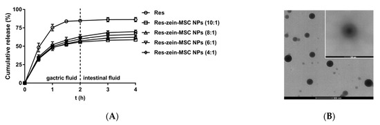 The release profiles of Res and Res-zein-MSC NPs (A); TEM images of Res-zein-MSC NPs before and after (upper right corner) pepsin digestion (B).