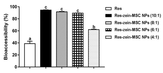 The bioaccessibility of Res and Res-zein-MSC NPs. Here, different letters represent significant differences (p < 0.05).