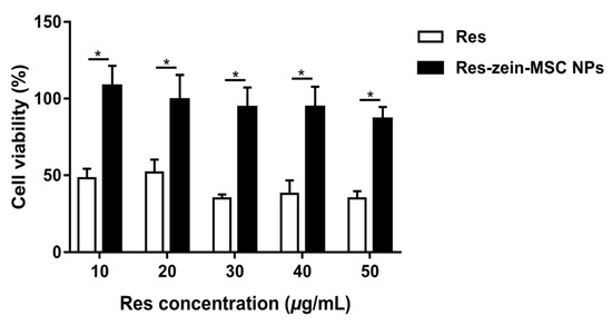 The cell viabilities of RAW 264.7 cells after treating with Res and Res-zein-MSC NPs. Here, * represents a significant difference between samples (p < 0.05).