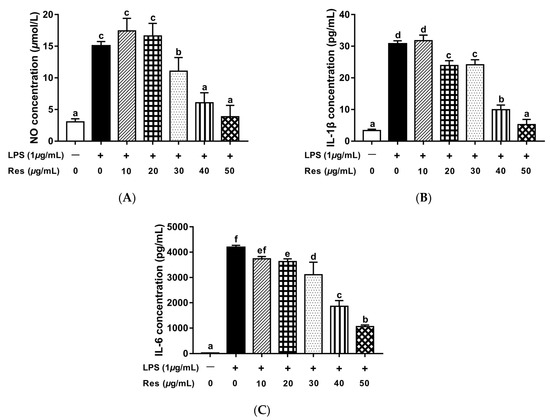 The effect of Res-zein-MSC NPs treatment on the secretion levels of NO (A), IL-1β (B) and IL-6 (C) in LPS-induced RAW 264.7 cells. Here, different letters represent significant differences (p < 0.05).