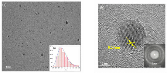 TEM (a) and HRTEM images (b) of MPA-InP/ZnS QDs (inset: particle size distribution (i) and CCD image of MPA-InP/ZnS QDs (ii)). TEM: transmission electron microscopy, HRTEM: high resolution transmission electron microscope, MPA-InP/ZnS QDs: mercaptopropionic acid capped InP/ZnS quantum dots, CCD: charge couple device.