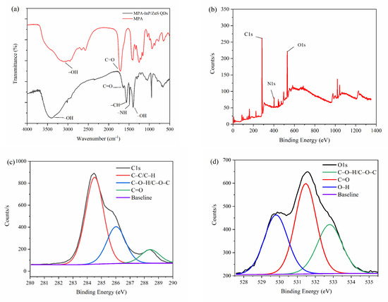 FT-IR spectra were obtained to investigate the functional groups on the surface of MPA-InP/ZnS QDs. As shown in Figure 2a, the FT-IR spectra of MPA (red curve) displays that the absorption bands at 3142 cm−1 and 1701 cm−1 are attributed to the stretching vibration of the O–H and the C=O of COOH, respectively. The FT-IR spectra of MPA-InP/ZnS QDs (black curve) shows the absorption band at 3396 cm−1 is attributed to the stretching vibration of the O–H band of COOH. The peaks at 1640, 1568, 1486, and 1396 cm−1 are caused by the stretching vibrations of the C=O, C–H, –NH, and –OH bonds, respectively. The presence of carboxyl hydroxyl and amine groups was demonstrated on the surface of the MPA-InP/ZnS QDs [23], which are beneficial to the homogenous and stable dispersion of MPA-InP/ZnS QDs in water [24] and indicating the InP/ZnS QDs are successfully capped by MPA. XPS spectra were recorded to investigate the surface elements of the MPA-InP/ZnS QDs. As shown in Figure 2b, the XPS spectrum of MPA-InP/ZnS QDs shows three peaks at 284.8, 402.4, and 532.0 eV, which correspond to the C1s, N1s, and O1s orbitals with relative atomic percentages of 73.96%, 5.01%, and 21.03%, respectively. The high-resolution C1s and O1s XPS spectra, as shown in Figure 2c,d, demonstrate the presence of C–C/C–H, C–O–H/C–O–N, O–H, and C=O, which agrees with the FT-IR spectra. The XPS spectra shows that the MPA-InP/ZnS QDs contain a large number of carboxyl groups, which further indicates that the InP/ZnS QDs are successfully capped by MPA.