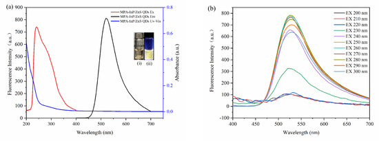 The absorption spectrum, excitation, and emission spectroscopy (a). (insert: photos of MPA-InP/ZnS QDs solutions under sunlight (i) and UV light (365 nm)) (ii) Emission spectroscopy with different excitation of MPA-InP/ZnS QDs (b). MPA-InP/ZnS QDs: mercaptopropionic acid capped InP/ZnS quantum dots.