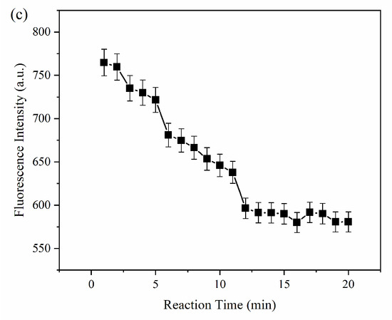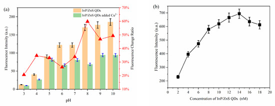 The influence of pH, the concentration of MPA-InP/ZnS QDs, and the reaction time were investigated to optimize the conditions of reaction conditions for the detection of Cu2+. As shown in Figure 4a, the ratio of the fluorescence quenching of the MPA-InP/ZnS QDs with Cu2+ (50 nM, 100 μL) added in PBS buffer at different pH values (2–10) was recorded, and the fluorescence was quenched most obviously at pH = 8.0. Thus, the value of 8.0 was used as the optimum pH. Figure 4b shows that the fluorescence intensity of MPA-InP/ZnS QDs at a concentration of 14 nM was the strongest, which means that the quenching degree may be the greatest in the presence of same concentration of Cu2+. In order to investigate this issue further, the fluorescence intensity of MPA-InP/ZnS QDs in the concentration of 6 nM, 10 nM, 14 nM, and 18 nM in the presence of different concentrations of Cu2+ were measured. As shown in Figure S1 of Supplementary Materials, in the concentrations of Cu2+ of 0–1000 nmol/L, the MPA-InP/ZnS QDs solution with a concentration of 14 nM has the greatest degree of fluorescence quenching. The results indicated that 14 nM is the best concentration. Furthermore, the time-based fluorescence behavior of the MPA-InP/ZnS QDs with added Cu2+ was studied, and it is shown in Figure 4c that the fluorescence was stable after 12 min. Therefore, we chose 12 min as the incubation time for the complete reaction of MPA-InP/ZnS QDs and Cu2+. All the following experiments were performed under the optimum conditions.