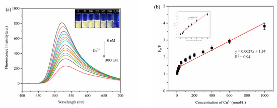 Next, 100 μL of different concentrations of Cu2+ (0 nM, 3 nM, 5 nM, 10 nM, 15 nM, 20 nM, 30 nM, 50 nM, 100 nM, 150 nM, 200 nM, 250 nM, 300 nM, 400 nM, 600 nM, and 1000 nM) were added to 2 mL of MPA-InP/ZnS QDs PBS solution (14 nM, pH = 8.0) for 12 min incubation at room temperature, and the fluorescence spectra were recorded (λex = 250 nm). The calibration curves of the fluorescence intensity at the emission peak of 520 nm vs. the concentrations of Cu2+ were plotted.