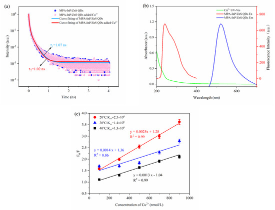 The fluorescence-quenching mechanism of quantum dots is complicated, generally including inner filter effect (IFE), fluorescence resonance energy transfer (FRET), photoinduced electron transfer (PET), static quenching effect (SQE), and dynamic quenching. The FRET, PET, and dynamic quenching can cause the fluorescence lifetime of the fluorophore to decay after adding a quencher, while IFE and SQE cannot [27]. As shown in Figure 7a, the fluorescence decay lifetimes of the MPA-InP/ZnS QDs without and with Cu2+ were 1.07 ns and 1.02 ns, respectively; these values were almost unchanged, indicating that FRET, PET, and dynamic quenching do not occur between MPA-InP/ZnS QDs and Cu2+. Moreover, IFE can be confirmed by UV-Vis absorption spectrum because IFE requires a certain degree of overlap between the excitation or emission band of the fluorophore and the absorption band of the UV-Vis spectrum of the quencher [28]. As shown in Figure 7b, the absorption band of Cu2+ in the range of 200 nm to 270 nm with a peak at 205 nm was observed, and the absorption band of Cu2+ overlaps with the excitation peak of the MPA-InP/ZnS QDs at 250 nm, indicating that the IFE may exist in the quenching mechanism. To further confirm the quenching mechanism, a typical Stern–Volmer diagram was constructed: