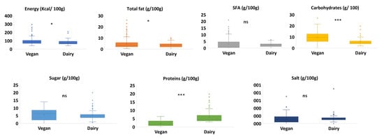 Nutritional profile of vegan alternatives to yogurt (n = 182) vs. natural dairy yogurt (n = 86). The box-plot legend: the box is limited by the lower (Q1 = 25th) and upper (Q3 = 75th) quartile; the median is the horizontal line dividing the box; whiskers above and below the box indicate the 10th and 90th percentiles; outliers are the points outside the quartile 10–90th percentiles. *: p < 0.05, ***: p < 0.001, ns: non-significant (p > 0.05).