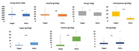 Nutritional profile of vegan alternatives to processed cheese (n = 114) vs. dairy processed cheese (n = 115). The box-plot legend: the box is limited by the lower (Q1 = 25th) and upper (Q3 = 75th) quartile; the median is the horizontal line dividing the box; whiskers above and below the box indicate the 10th and 90th percentiles; outliers are the points outside the quartile 10–90th percentiles. *: p < 0.05, **: p < 0.01, ***: p < 0.001, ns: non-significant (p > 0.05).