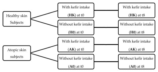 Study design regarding skin conditions and kefir intake during the eight-week intervention period: HK—healthy skin with kefir intake; H0—healthy skin without kefir intake; AK—atopic skin with kefir intake; A0—atopic skin without kefir intake.
