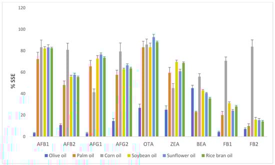 Oil is an important ingredient used in the preparation of foods [], with edible oils being processed from various grains, such as soybean, rapeseed, sunflower seed, peanut, and olive []. The processed edible oils can easily become contaminated by mycotoxins originating in the seed before the crop has been harvested to produce their oils []. Oil from olives (Olea europaea L.) is a major product of the west coast USA, Turkey, Spain, Greece, Italy, and Morocco. This oil is considered to be a vital component of the human diet and is consumed along with bread or as an ingredient in salad and baked foods []. Contamination by aflatoxins (AFs) and ochratoxin A (OTA) is common in olive oil []. Hidalgo-Ruiz et al. [] reported that 153 olive oil samples in Spain were contaminated by zearalenone (ZEA; 0.6–21.1 µg/kg), aflatoxin G1 (AFG1; 1.1–6.8 µg/kg), and aflatoxin G2 (AFG2; 0.8–1.9 µg/kg). Soybeans are a major source of protein for both human and animal consumption and can be contaminated by AFs, trichothecene (such as T-2 toxin), and cytochalasins []). Sunflower seeds (Helianthus annuus L.) are a good source of fiber, minerals, and vitamin E and have good antimicrobial and antioxidant properties, but the seeds can be contaminated by many fungi, such as Fusarium verticillioides, Penicillium chrysogenum, Alternaria alternata, Aspergillus spp., Cladosporium spp., Drechslera spp., and Curvularia spp. []. Maize (Zea mays L.) is one of the most important cereals globally, which is used as a basic raw material to prepare food products such as flour, grits, breakfast cereals, baby food, and germ oil; however, there have been many reports that it was contaminated by ZEA and fumonisin B1 (FB1) [,,]. Rice bran oil is extracted from the inner husk and germ of rice (Oryza sativa L.). This oil is gaining popularity for its potential health benefits, as it contains ample amounts of oleic, linoleic, and palmitic acids. Again, there have been reports of various types of fungi in rice bran oil, such as A. niger, A. flavus, A. candidus, A. glaucus, A. nidulans, A. fumigatus, Penicillium spp., and Gliocladium viride []. The European Union (EU) mandated the maximum level of ZEA in refined maize oil at 400 µg/kg []. In addition, the EU set the maximum level in oilseed at 2.0 µg/kg for aflatoxin B1 (AFB1) and 4.0 µg/kg for the sum of four aflatoxins (AFB1, AFB2, AFG1, and AFG2) []. Considering the health impact of mycotoxin consumption, there is an urgent need to obtain data on multi-mycotoxin contamination in vegetable oils to better respond to potential problems. Therefore, the current study used a validated liquid chromatography- tandem mass spectrometry (LC–MS/MS) with a QuEChERS procedure to investigate the occurrence of multi-class mycotoxins, namely, AFB1, AFB2, AFG1, AFG2, OTA, ZEA, FB1, FB2, and beauvericin (BEA), in six types of common vegetable oils, namely, olive oil, palm oil, soybean oil, corn oil, sunflower oil, and rice bran oil, that have been commercialized in Thailand.